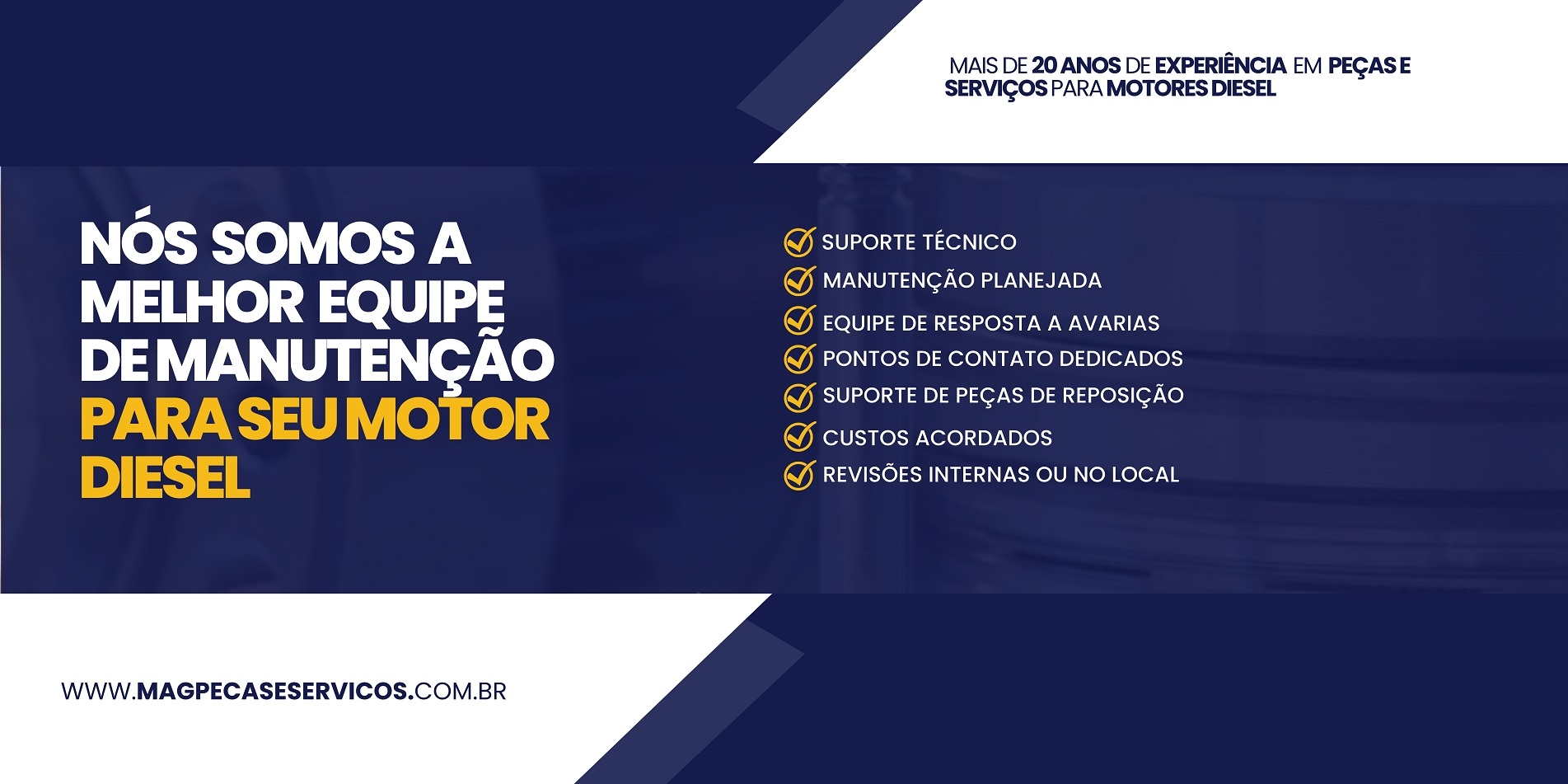 A MAG Peças e Serviços conta com profissionais qualificados e atualizados, preparados para executar serviços de Assistência Técnica em motores diesel. Nossa oficina possui estrutura e ferramentas especiais de diagnóstico, para reparos e revisões em motores e seus componentes, leitura técnica e sistemas integrados.